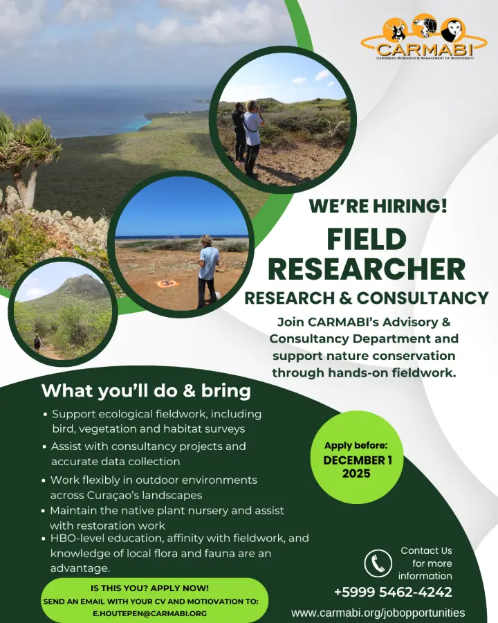 CARMABI’s Advisory & Consultancy Department is looking for a motivated Field Researcher to support ecological research and environmental consultancy projects on Curaçao. This role is ideal for someone who enjoys working outdoors, values accuracy, and wants to contribute to the protection and sustainable management of our island’s natural environment.